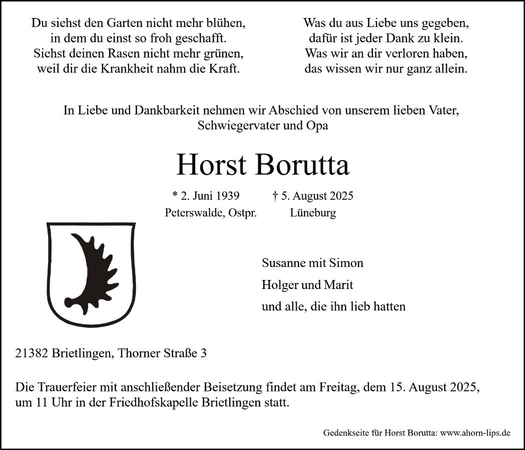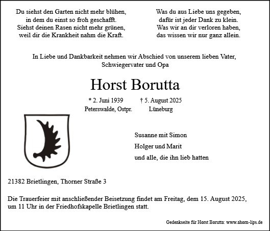 Aufrichtiges Beileid an die gesamte Familie von Horst Borutta, die Angehorign senden Rossmann, Krawczyk, Kłosowski und alle Freunde aus Peterswalde