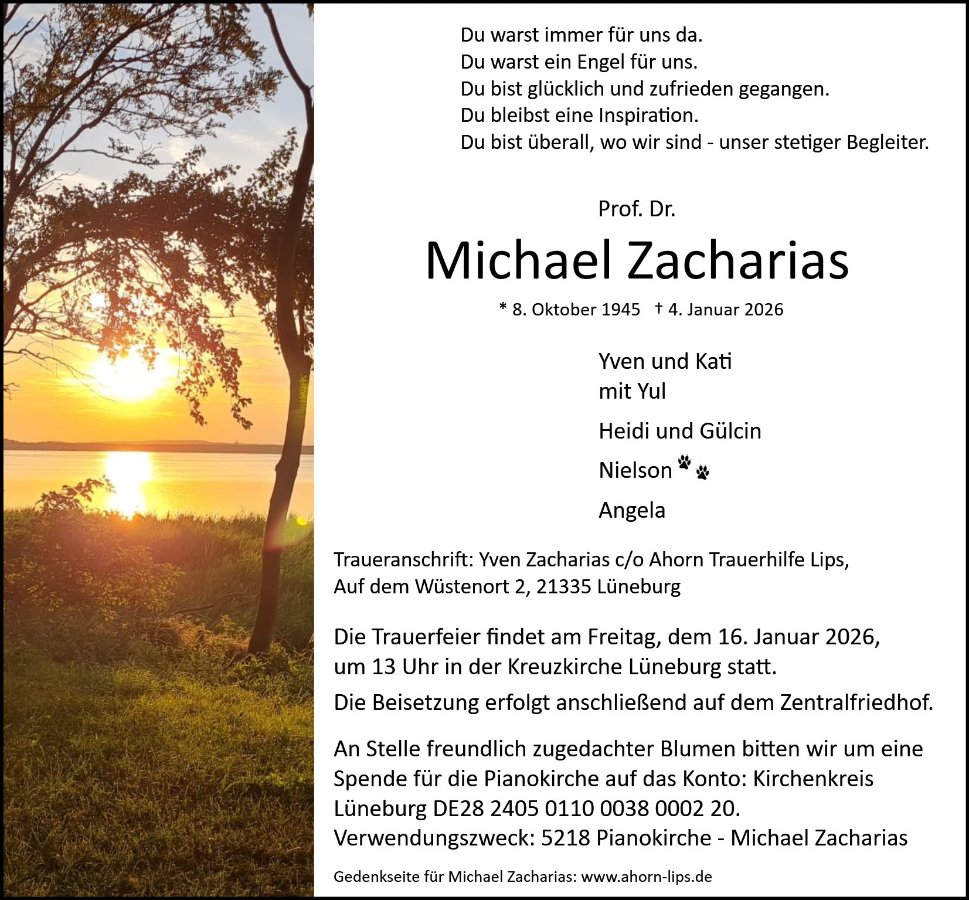 Michaels plötzlicher Tod ist nicht fassbar! Michael war so mitten im Leben präsent, dass es einfach nicht passt, jetzt von ihm Abschied nehmen zu müssen. Er war in unserer Mitte Ruhe, Klarheit, Freundlichkeit, Halt, Inspiration. Er hatte ein bewusstes Ständing, aber auch Humor. Er war immer menschlich eingestellt und hilfsbereit, engagiert in mehreren Bereichen unserer Kreuzkirchengemeinde, der Gesellschaft, Wirtschaft und Wissenschaft. Viele von uns kennen ihn auch mit Nilson an seiner Seite. Vor allem aber das Zusammenwohnen mit seinem Sohn Yven, Schwiegertochter Kati und Enkelsohn Yul war für ihn eine wunderbare familiäre Lebenserfüllung.
